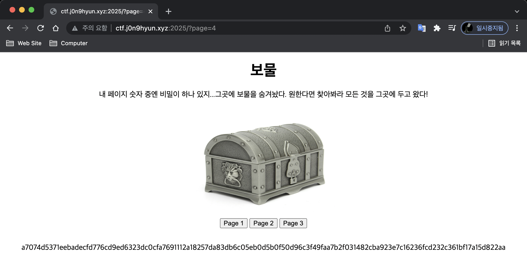 해당 url로 이동하면 "내 페이지 숫자 중엔 비밀이 하나 있지...그곳에 보물을 숨겨놨다. 원한다면 찾아봐라 모든 것을 그곳에 두고 왔다!"