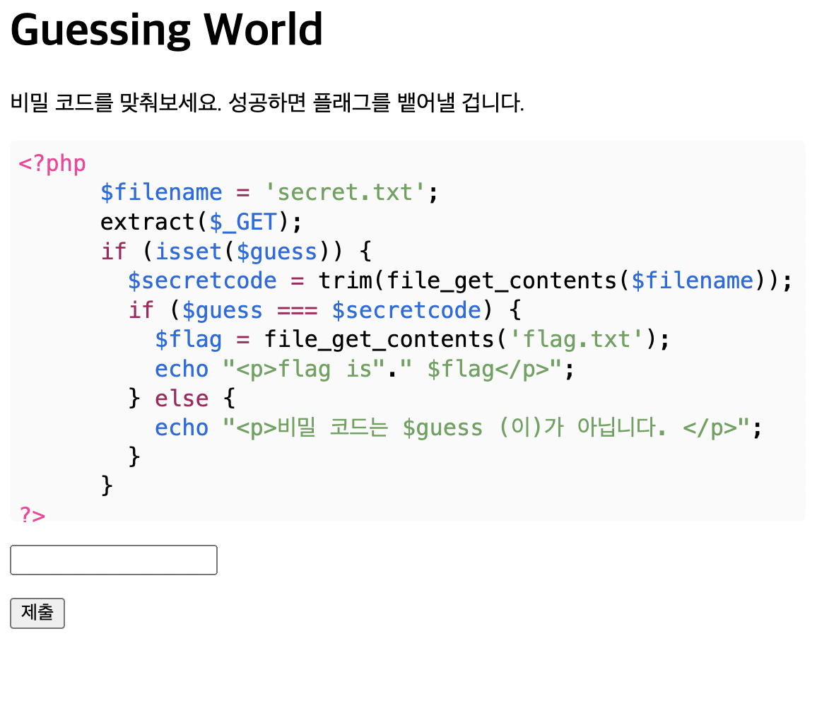 해당 url로 이동하면 "비밀 코드를 맞춰보세요. 성공하면 플래그를 뱉어낼 겁니다."라는 문구과 함께 php 소스와 1개의 입력칸 1개의 버튼을 띄워준다.